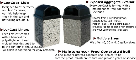 Concrete Trash and Litter Receptacle site amenities are manufactured to be attractive, sturdy, and affordable. These Concrete Trash and Litter Receptacles are made with